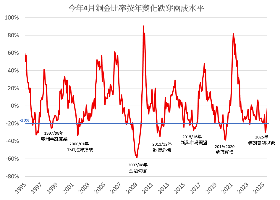 實際上,根據多年數據顯示,每當銅金比率的按年變化跌穿 -20%,往往預示全球經濟表現疲弱,金融市場也大多陷入某種危機之中。舉例而言,2007/08年金融海嘯、2019/20年新冠疫情,以及今年初因貿易關稅爭端引發的市場動盪期間,銅金比率的年變幅均曾跌破 -20% 關口,顯示其警示效果頗具準確性(見圖1)。