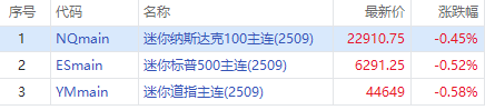 特朗普擬多數貿易伙伴徵收15%-20%全面關稅;美股三大指數期貨週四盤前微跌,納指期貨 $NQmain 跌0.45%,標普500期貨 $ESmain 跌0.52%,道指期貨 $YMmain 跌0.58%。
