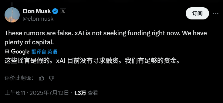 對此,馬斯克回應稱:“這些傳言不實。xAI目前並未尋求融資,我們有充足的資金。”