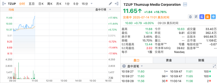 華盛資訊7月14日訊,Thumzup Media $TZUP 盤中快速走高,漲超18%,報11.65美元。