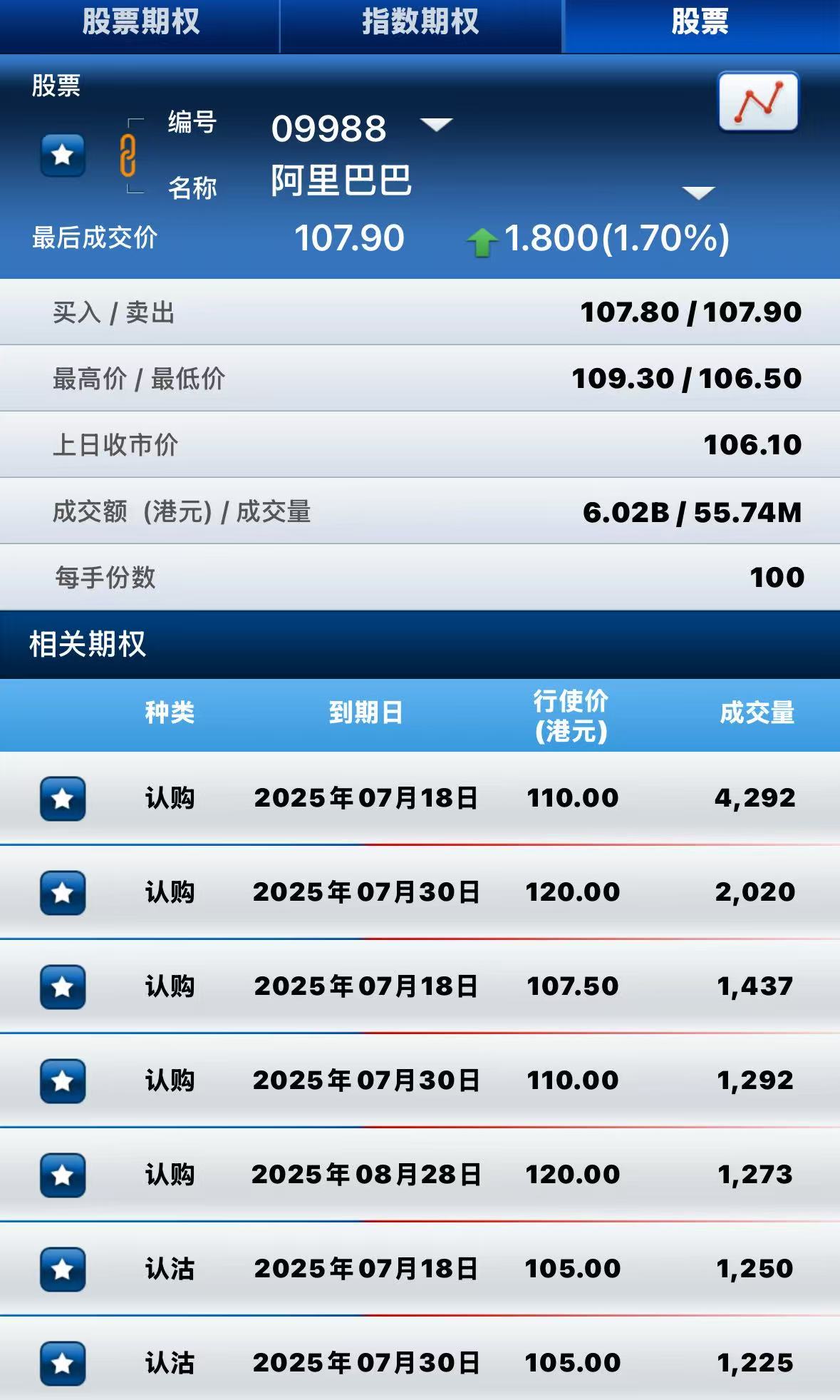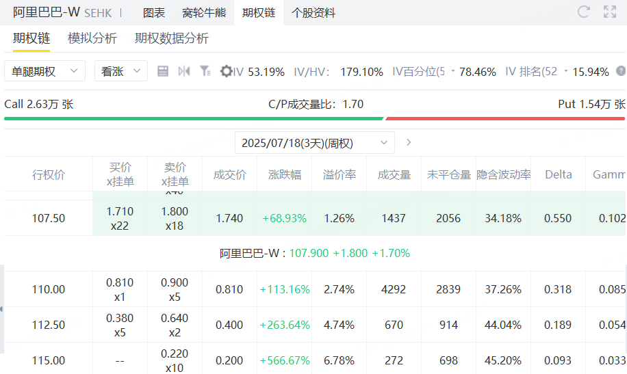 阿里巴巴-W早盤上漲1.7%,期權方面:半日成交近4.2萬張合約,其中於7月18日到期行權價110港元的認購期權成交量居前,成交超4200張合約。 $ALB.HK 20250718 110.00 CALL$
