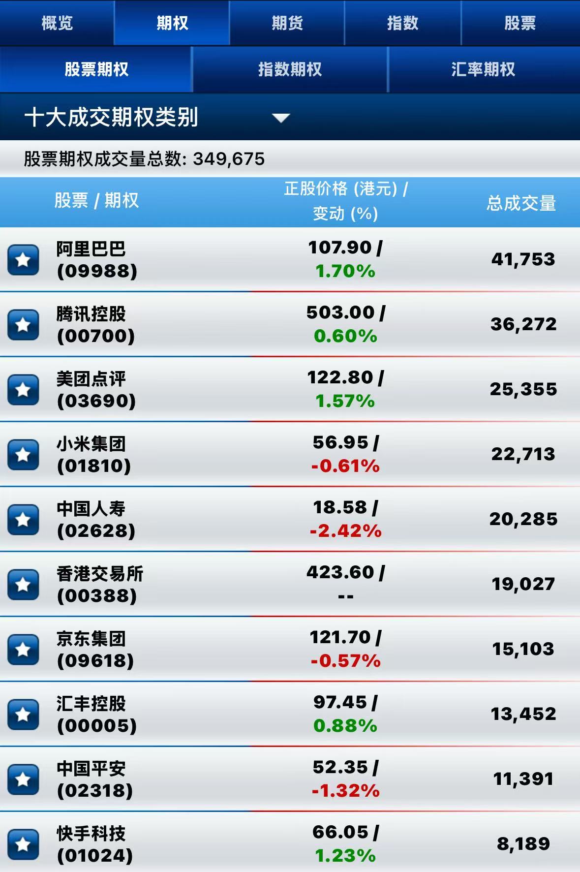 截止午間收盤,港股期權半日成交近35萬張,其中,阿里巴巴-W成交量居前,期權成交近4.2萬張;騰訊控股名列次席,期權成交超3.6萬張;美團-W位居第三,期權成交超2.5萬張。