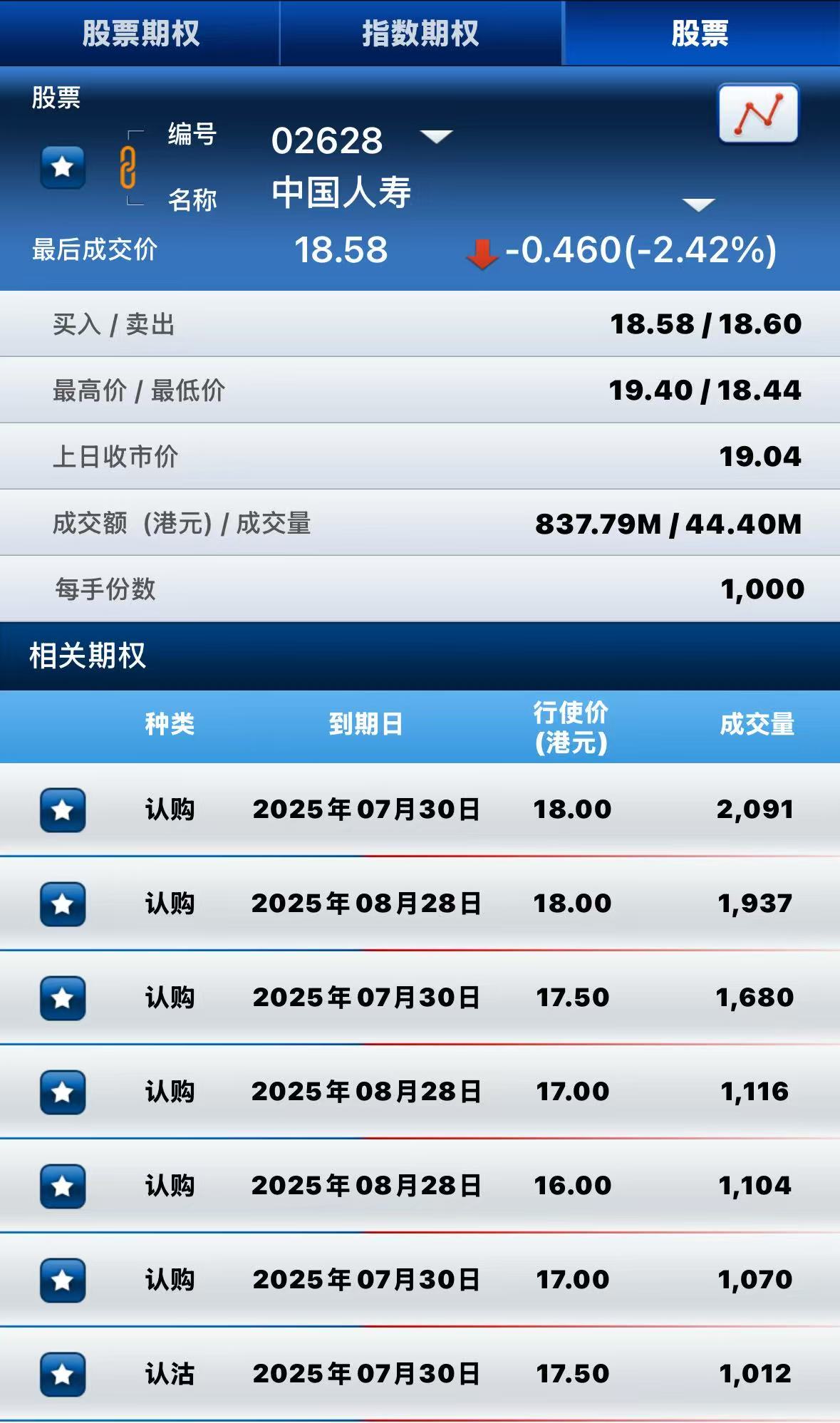 中國人壽早盤跌超2%,期權方面:半日成交超2萬張合約,其中於7月30日到期行權價18港元的認購期權成交量居前,成交超2000張合約。 $CLI.HK 20250730 18.00 CALL$