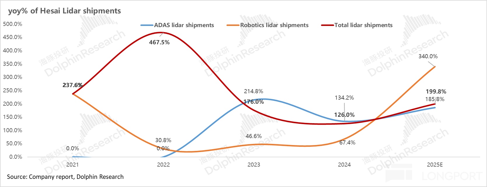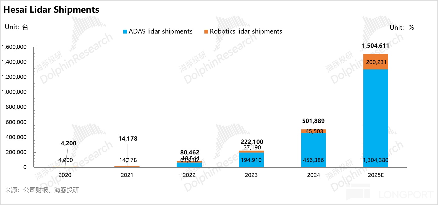 在 2025 年,禾賽指引總激光雷達出貨量爲 120-150 萬臺,而其中 100-130 萬顆是 ADAS 激光雷達的出貨。