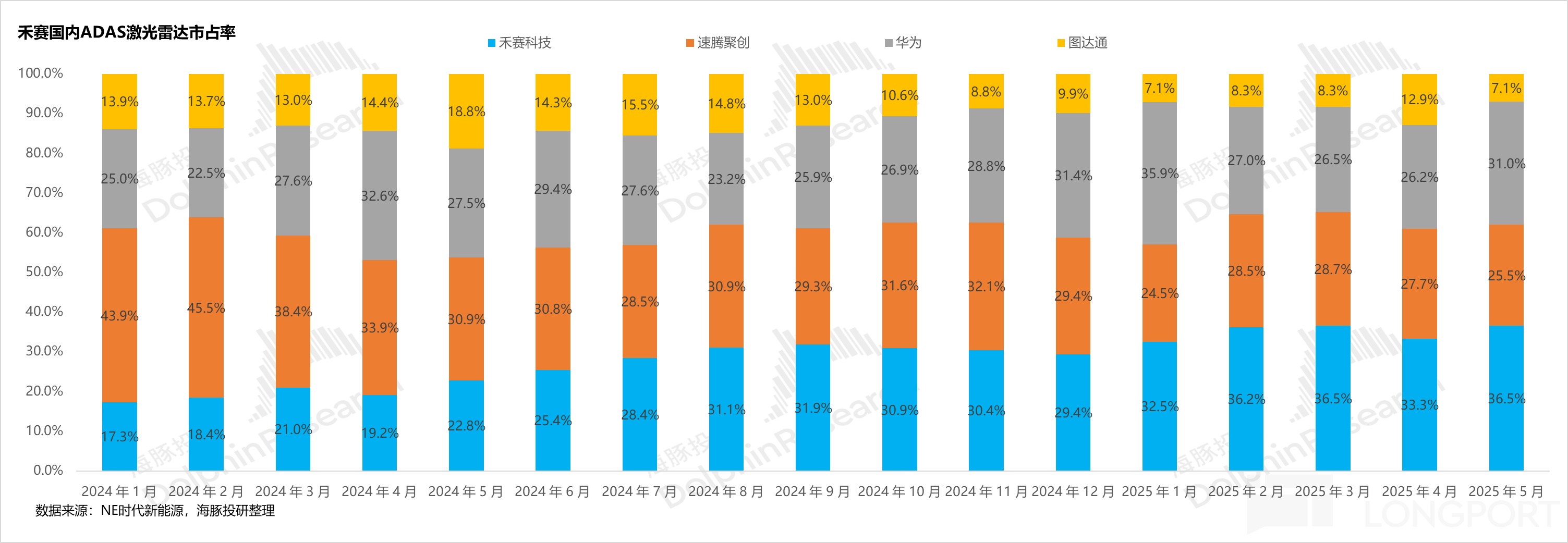 在從 2024 年 1 月,速騰的激光雷達出貨量市佔率還處於反超禾賽的狀態,但後續禾賽在國內 ADAS 激光雷達的市佔率不斷提升,在 2024 年 7 月開始就實現了對速騰的反超,而在 2025 年一季度 ATX 出貨之後,禾賽從出貨量來看,也成功登頂國內 ADAS 激光雷達的龍一地位。