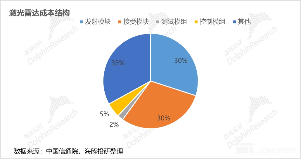 在激光雷達的成本結構中,根據中國信通院數據,光電系統佔激光雷達整機成本約 70%,由激光發射模組、激光接收模組、測時模組(TDC/ADC)、控制模組四部分構成,其中激光收發模組成本佔比更高,佔激光雷達整機成本約 60%,是激光雷達最核心的部件。