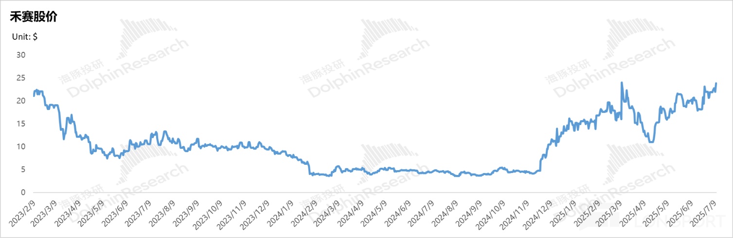 而截至 2025 年 7 月 14 日收盤, 禾賽的股價漲幅相比去年三季報前的上一輪估值大漲啓動點已經翻了有 4 倍!