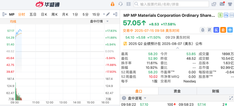 稀土礦企MP Materials $MP 盤初飆升,蘋果5億美元投資響應特朗普稀土戰略。