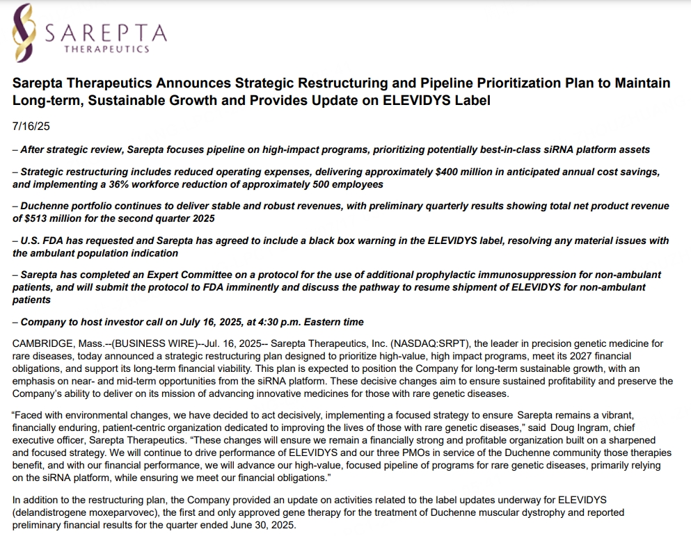 生物製藥公司Sarepta Therapeutics宣佈戰略重組和產品線優先計劃