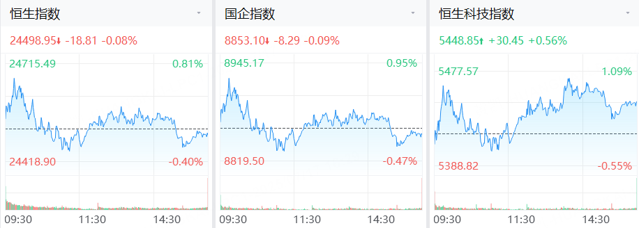 港股三大指數漲跌不一, 恒生指數跌0.08%, 恒生科技指數漲0.56%, 國企指數跌0.09%。