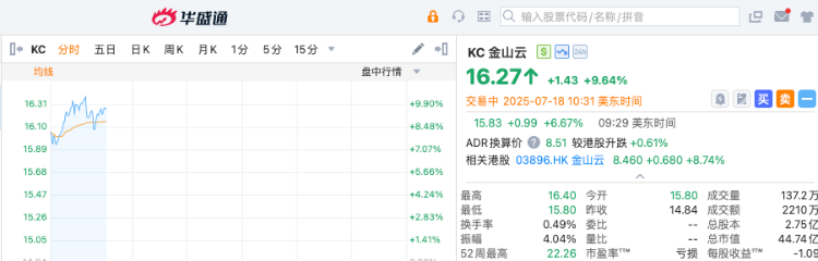 個股方面,金山雲漲超9%,虎牙漲超8%,中通快遞漲超6%,京東、小馬智行漲超5%,嗶哩嗶哩漲超4%,阿里巴巴、蔚來漲超3%。