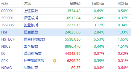 A股方面,本週上證指數漲幅 0.69%,報 3,534.48點 ;深證成指漲幅 2.04%,報 10,913.84點 ;創業板指漲幅 3.17%,報 2,277.15點
