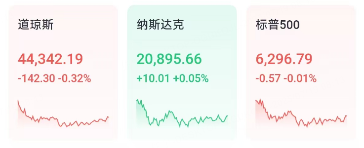 7月18日週五,美股三大指數漲跌不一。道指跌142.30點,跌幅爲0.32%,報44342.19點;納指漲10.01點,漲幅爲0.05%,報20895.66點;標普500指數跌0.57點,跌幅爲0.01%,報6296.79點。納指連續第五個交易日上漲,並創盤中與收盤歷史新高。