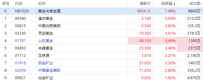 華盛資訊7月22日訊,港股盤初,黃金股集體走高,截至發稿,潼關黃金漲近6%,中國白銀集團、靈寶黃金、山東黃金、赤峯黃金漲超3%,招金礦業、中國黃金國際漲超2%。