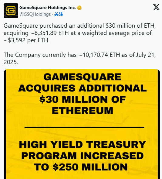 作爲擴展計劃的一部分,GameSquare 購買了價值 3000 萬美元的 ETH(按平均價格 3,592 美元計算,約合 8,351.89 ETH),使其截至 7 月 21 日的 ETH 總持有量超過 10,170 ETH。