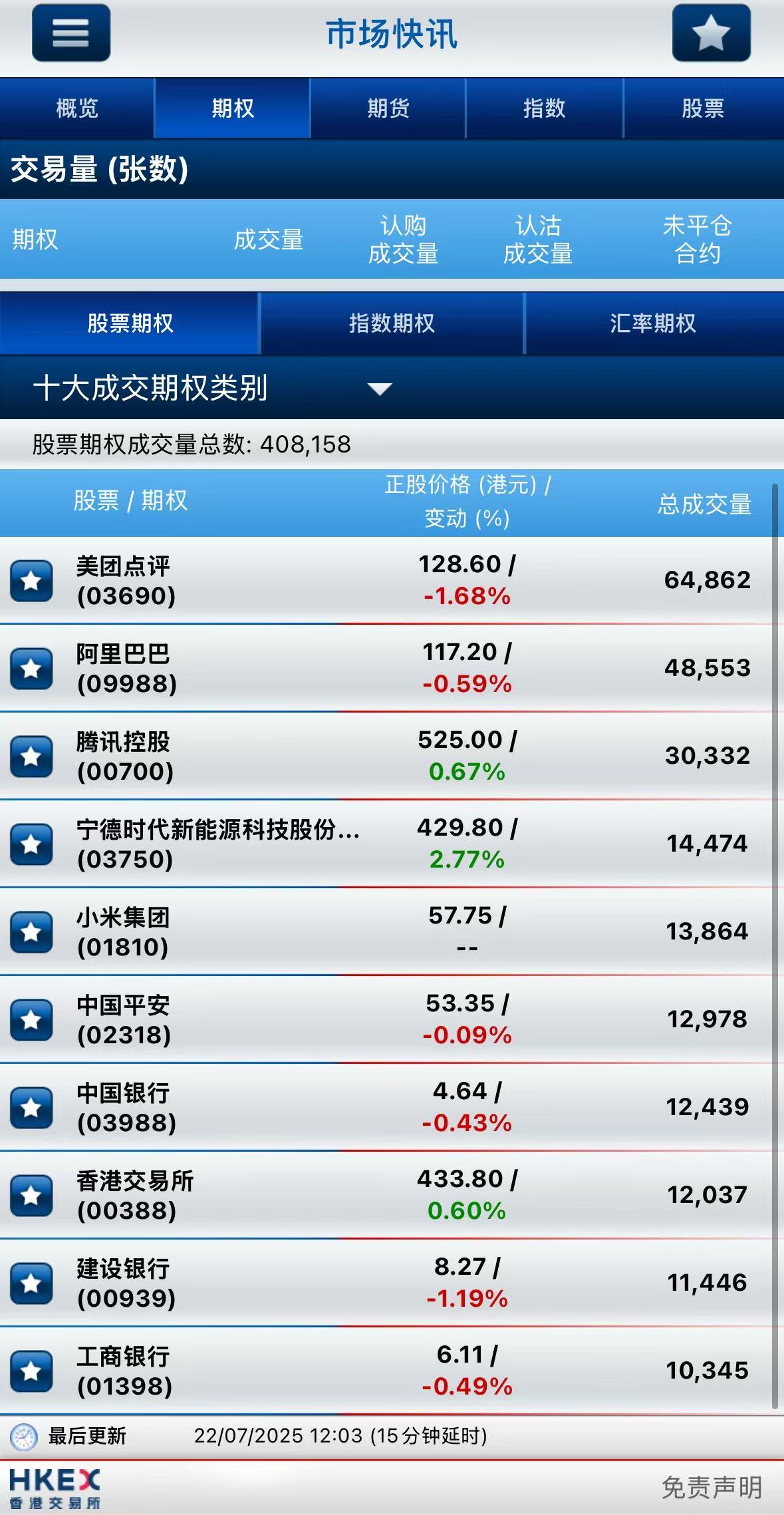 截止午間收盤,港股期權半日成交40.8萬張,較前一交易日小幅上漲;其中, 美團成交量居前,期權成交近6.5萬張;阿里巴巴名列次席,期權成交超4.8萬張;騰訊控股位居第三,期權成交超3萬張。