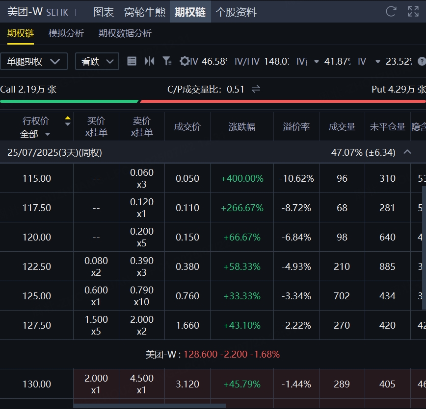 美團盤中一度跌近3%,截止午間收盤報128.6港元。期權方面,美團半日期權成交近6.5萬張,力壓阿里、騰訊佔據期權成交榜首位,其中認沽期權成交量居前。