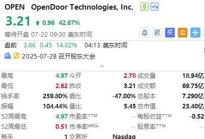 房地產科技公司Opendoor Technologies $OPEN 盤前漲超14%,週一曾漲超42%,因散戶投資者和社交媒體平臺突然熱捧,資金持續湧入,該股已連續第六個交易日暴漲,累漲312%。