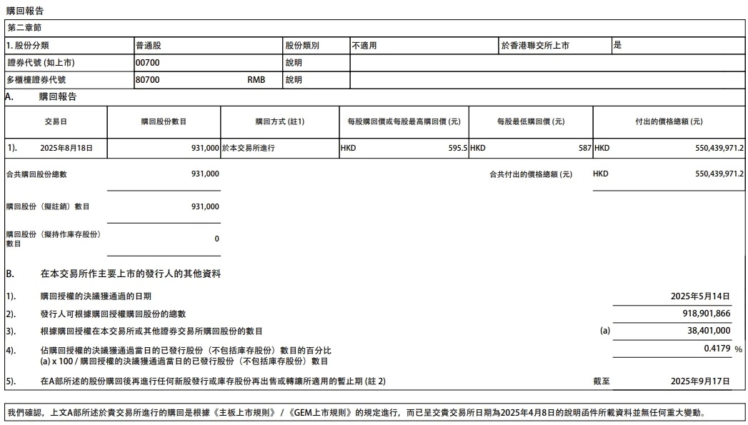 8月18日,騰訊控股回購93.1萬股,回購價格區間爲587港元至595.5港元,累計耗資約5.5億港元。
