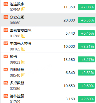 穩定幣概念多數上漲,連連數字漲超7%,衆安在線漲超6%,國泰君安國際漲超5%,移卡、中國光大控股漲超3%,多點數智漲超2%