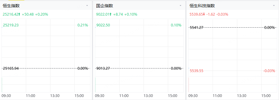8月21日(週四)香港恒生指數上漲50.48點,漲幅0.2%,報25216.42點;香港恒生科技指數下跌1.62點,跌幅0.03%,報5539.65點;國企指數上漲8.74點,漲幅0.1%,報9022.01點。