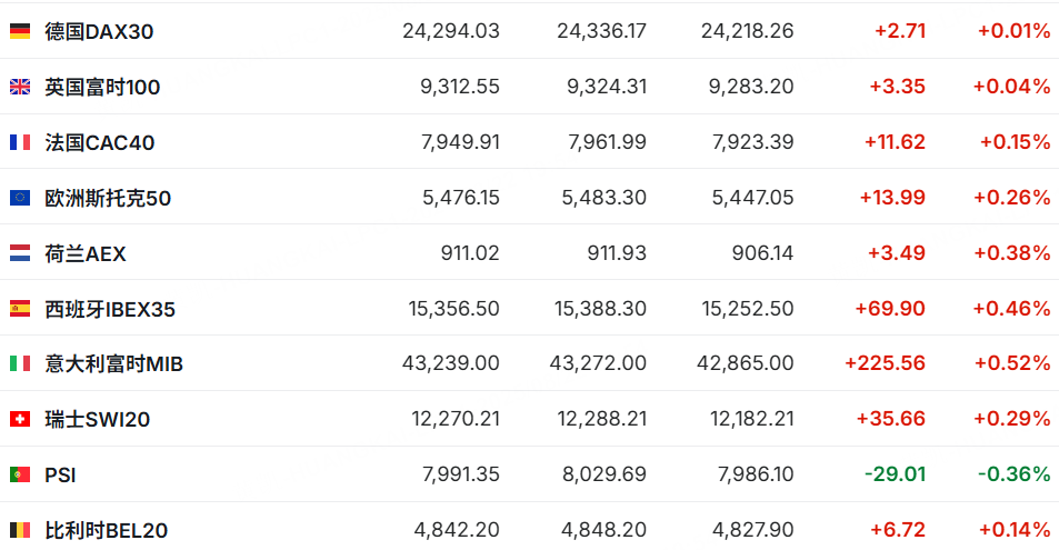 歐洲主要股指普遍上漲,德國DAX30漲0.01%,法國CAC40漲0.75%。