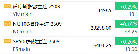 8月22日,美股三大股指期貨上漲,截止發稿,道指期貨漲0.29%,納指期貨漲0.16%,標普500指數期貨漲0.20%。