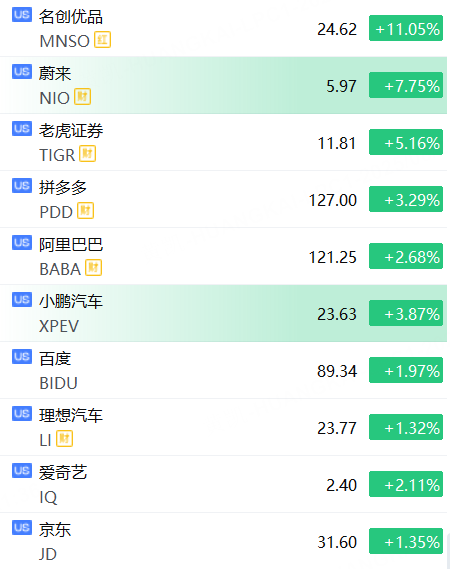 8月22日,中概股盤初上漲,名創優品漲超11%,蔚來漲超7%,小鵬汽車、拼多多漲超3%,阿里巴巴、愛奇藝漲超2%。