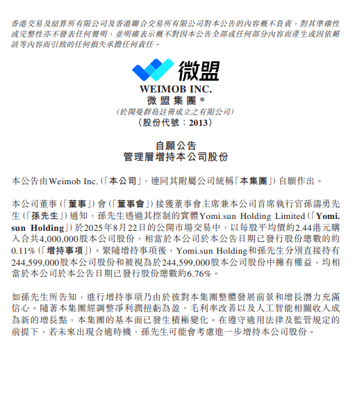 微盟集團在港交所公告,董事會接獲董事會主席兼公司首席執行官孫濤勇通知,孫濤勇透過其控制的實體Yomi.sun Holding Limited於2025年8月22日的公開市場交易中,以每股平均價約2.44港元購入合共400萬股本公司股份,相當於公司於本公告日期已發行股份總數的約0.11%。緊隨增持事項後,Yomi.sun Holding和孫濤勇分別直接持有244,599,000股公司股份和被視爲於244,599,000股公司股份中擁有權益,均相當於公司於本公告日期已發行股份總數約6.76%。