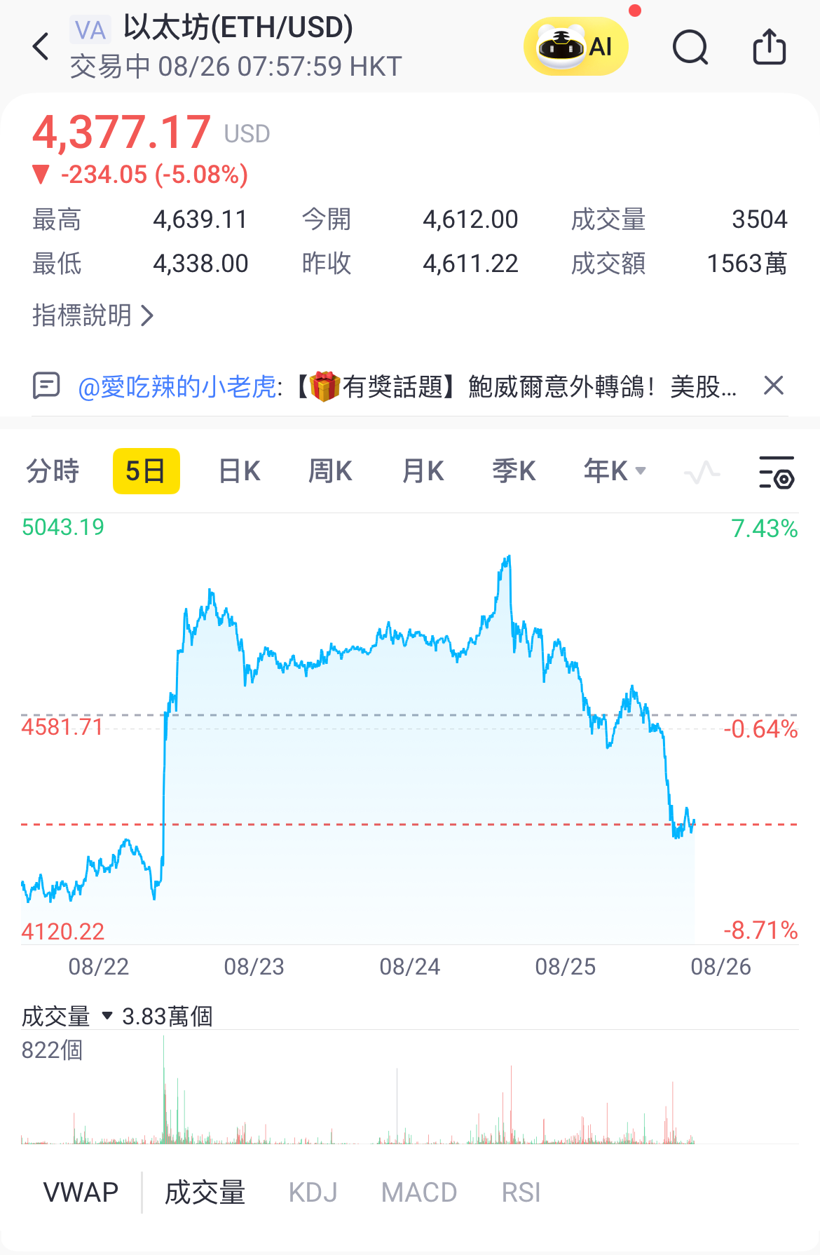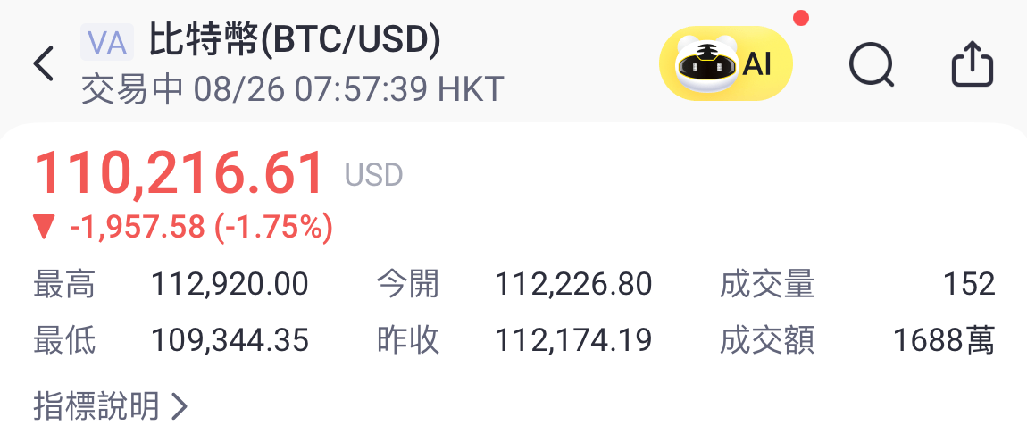 加密貨幣的上週的反彈亦已退散,比特幣曾跌穿11萬美元水平。以太坊急挫5%,失守4400美元。
