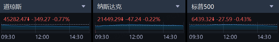 美東時間週一,美股三大指數集體收跌,沖淡了上週五美聯儲主席鮑威爾講話帶來的市場上漲餘溫。截至收盤,道瓊斯指數跌0.77%,報45,282.47點;標普500指數跌0.43%,報6,439.32點;納斯達克指數跌0.22%,報21,449.29點。