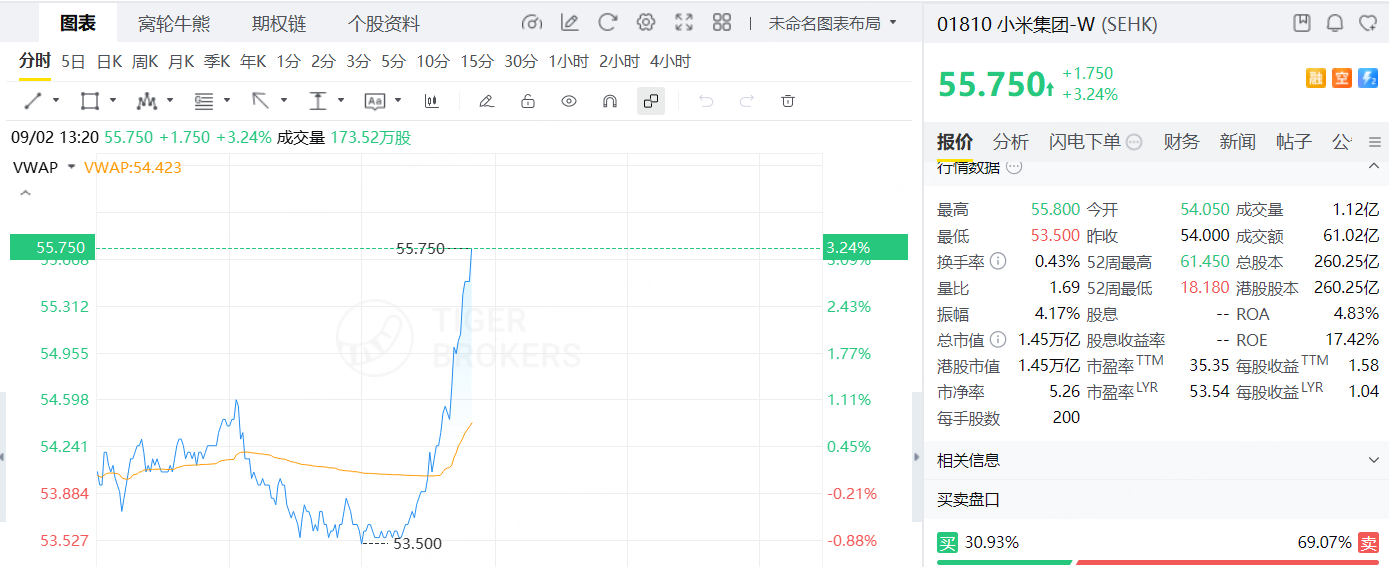 9月2日,小米集團-W午後逆市拉昇,現漲超3%,成交額超60億港元。