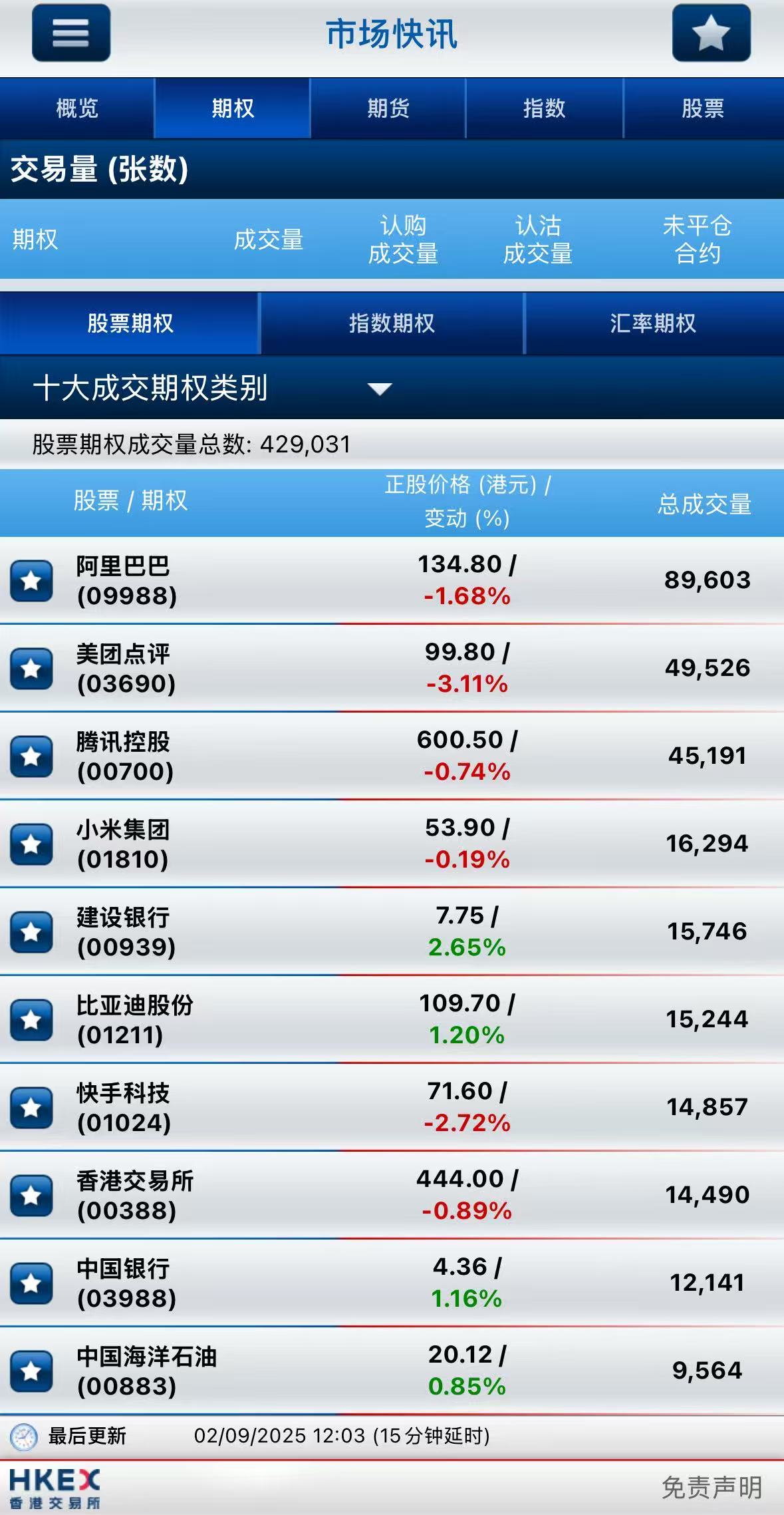 截止午間收盤,港股期權半日成交近43萬張,較前一交易日大幅下降;其中,阿里巴巴-W成交量居首,期權成交近9萬張;美團-W名列次席,期權成交近5萬張;騰訊控股位居第三,期權成交超4.5萬張。