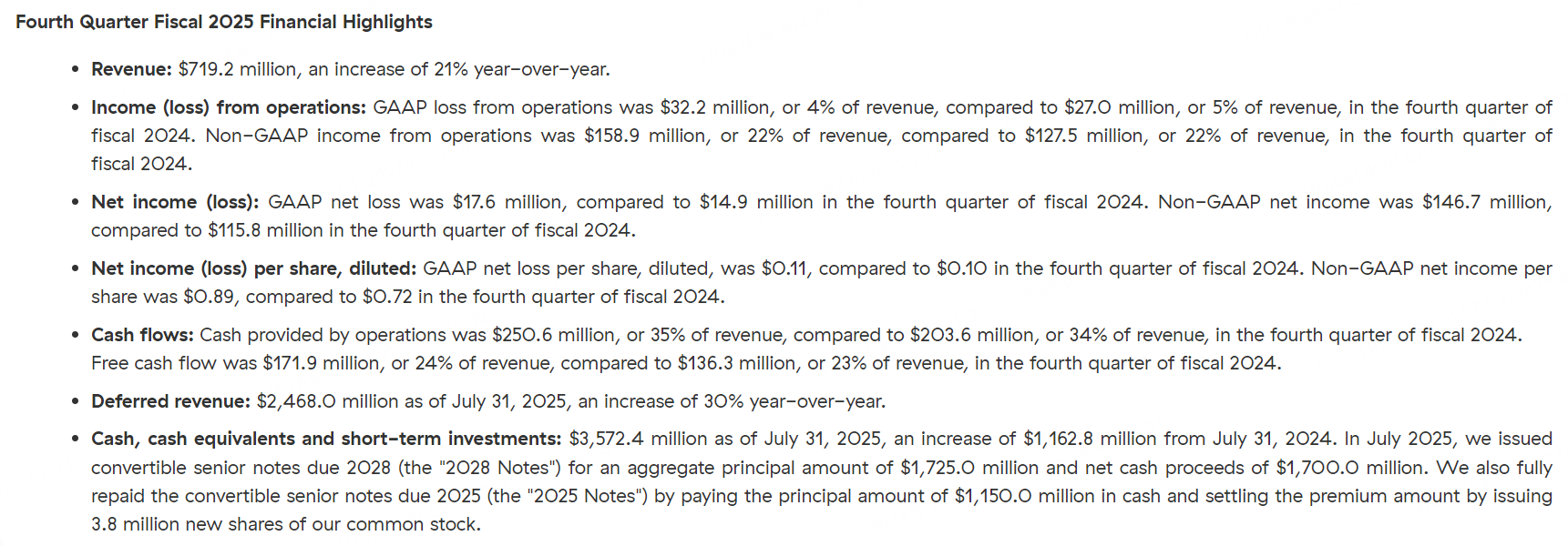 9月3日,網絡安全公司Zscaler公佈了2025財年第四季度財報,公司本季度營收達到 7.192 億美元,較上年同期增長 21%。按 非 GAAP 標準,公司本季度 攤薄後每股收益爲 0.89 美元,高於去年同期的 0.72 美元。