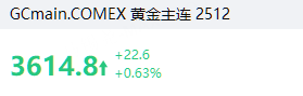 金價漲0.63%,報3,614.8美元/盎司。