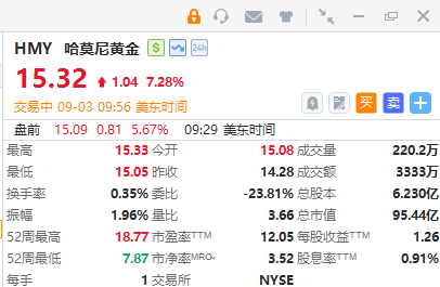 美股黃金股普遍上行,哈莫尼黃金漲超7%,AngloGold Ashanti漲近3%,金田漲近2%,科爾黛倫礦業漲超1.5%,泛美白銀漲近1%。