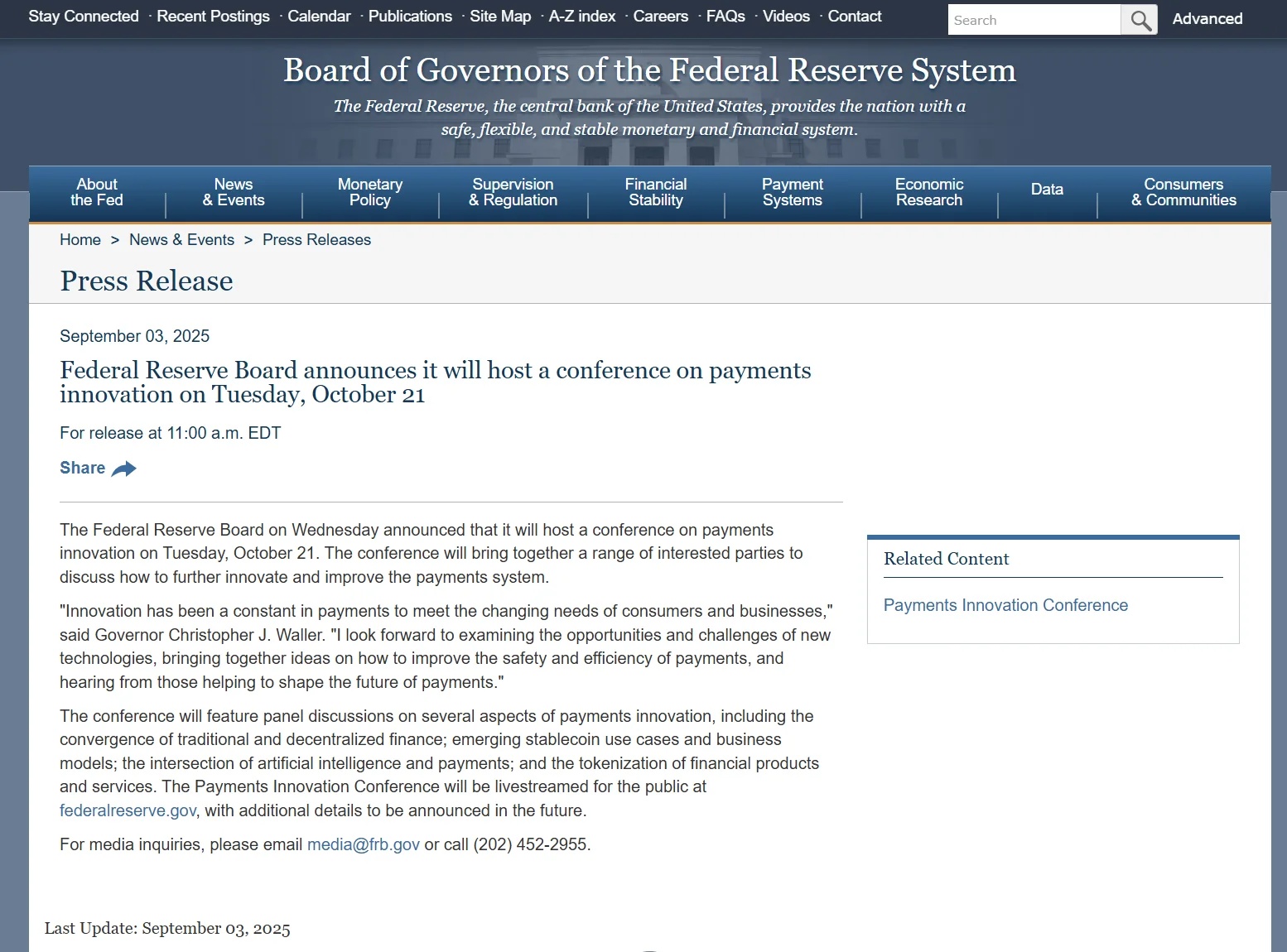 美聯儲將於10月21日舉行支付創新會議,會議將討論穩定幣、人工智能和代幣化