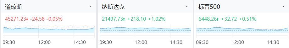 截至收盤,道瓊斯指數跌0.05%,報45271.23點;標普500指數漲0.51%,報6448.26點;納斯達克綜合指數漲1.02%,報21497.73點。