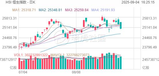 9月4日,港股延續昨日跌勢,三大指再度呈現高開低走行情,市場情緒持續低迷。截止收盤,恒生指數跌1.12%險守25000點大關,國企指數跌1.25%,恒生科技指數跌1.85%。