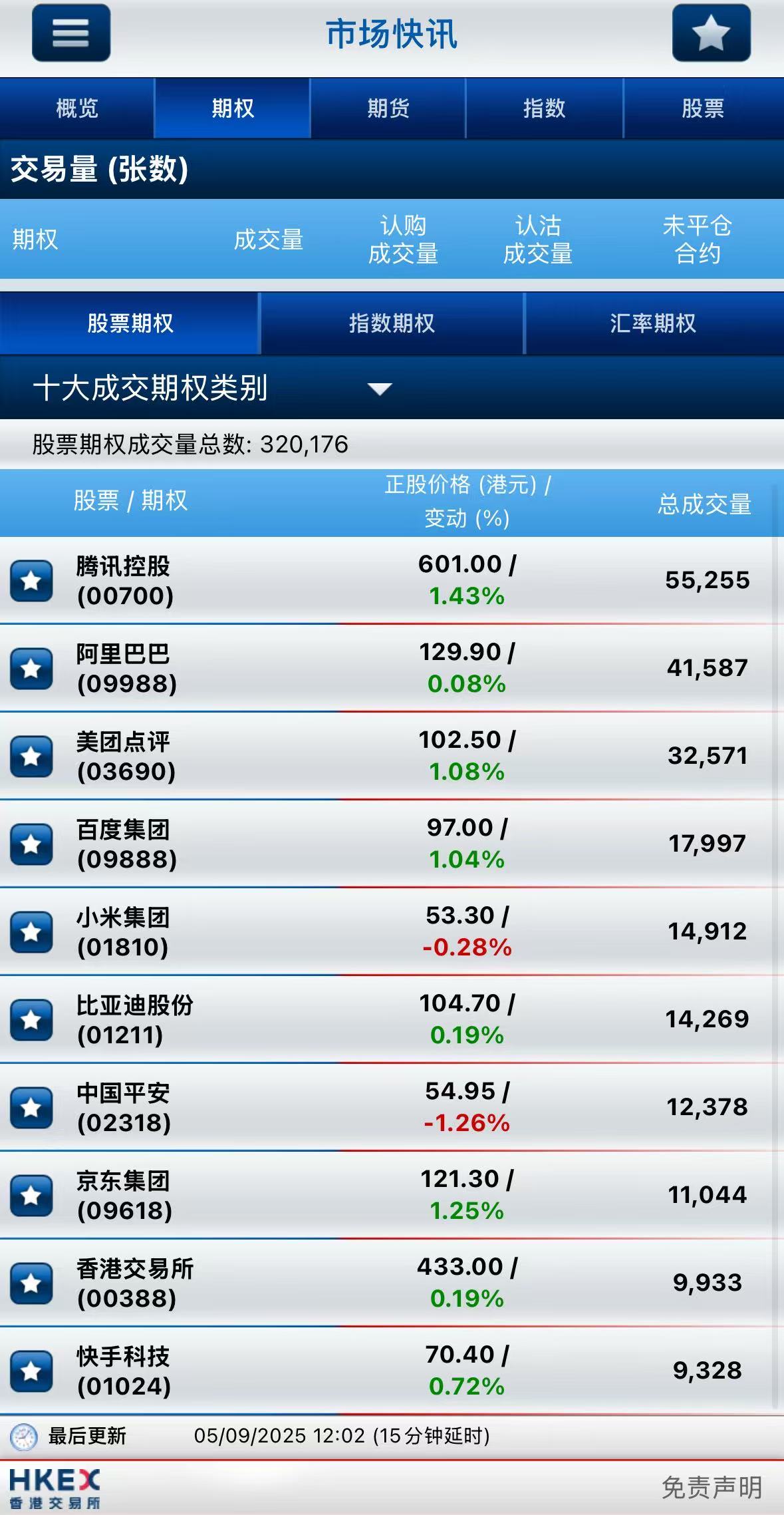 截止午間收盤,港股期權半日成交超32萬張,較前一交易日大幅下降;其中,騰訊控股成交量居首,期權成交超5.5萬張;阿里巴巴-W名列次席,期權成交超4.1萬張;美團-W位居第三,期權成交超3.2萬張。