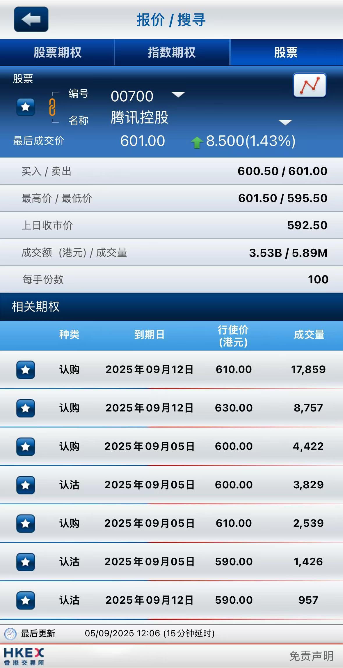 騰訊半日期權成交超5.5萬張,認購期權成交活躍,其中於9月12日到期610港元行使價的認購期權成交居前,成交近1.8萬張。