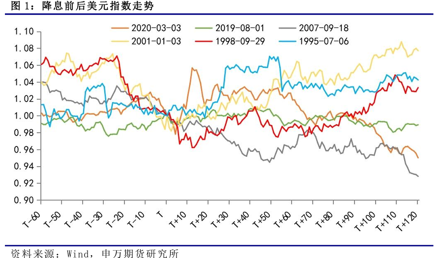 在1995年到1996年這一輪降息週期中,人民幣保持小幅升值。1995年,美國經濟邊際放緩,但沒有出現衰退跡象,美聯儲進行預防式降息,從 1995 年 7 月至 1996 年 1 月共進行三次降息,合計降息75個基點。在預防式降息後,美國經濟實現“軟着陸”,美元指數整體走強。1994年人民幣官方匯率與外匯調劑市場匯率並軌,從1994年到1997年,人民幣緩慢升值。