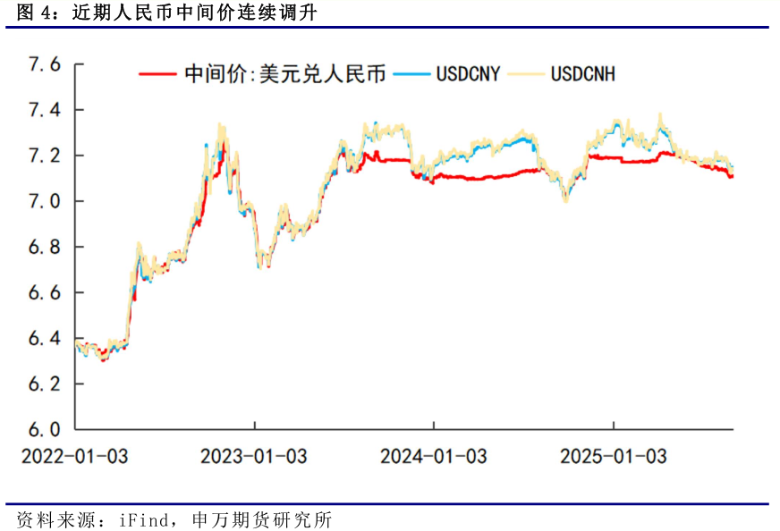 今年5月以來,人民幣中間價整體呈升值走勢,從5月份的7.2已經升至當前的7.1附近,人民幣中間價創2024年11月以來新高。8月底央行更是加速上調人民幣中間價,8月25日至8月29日當週人民幣中間價調升291個基點,8月25日人民幣中間價爲7.1161,較8月22日大幅調升160個基點。人民幣中間價的連續調升,釋放積極信號,對人民幣走強預期形成提振,在岸人民幣和離岸人民幣在8月末出現明顯升值。