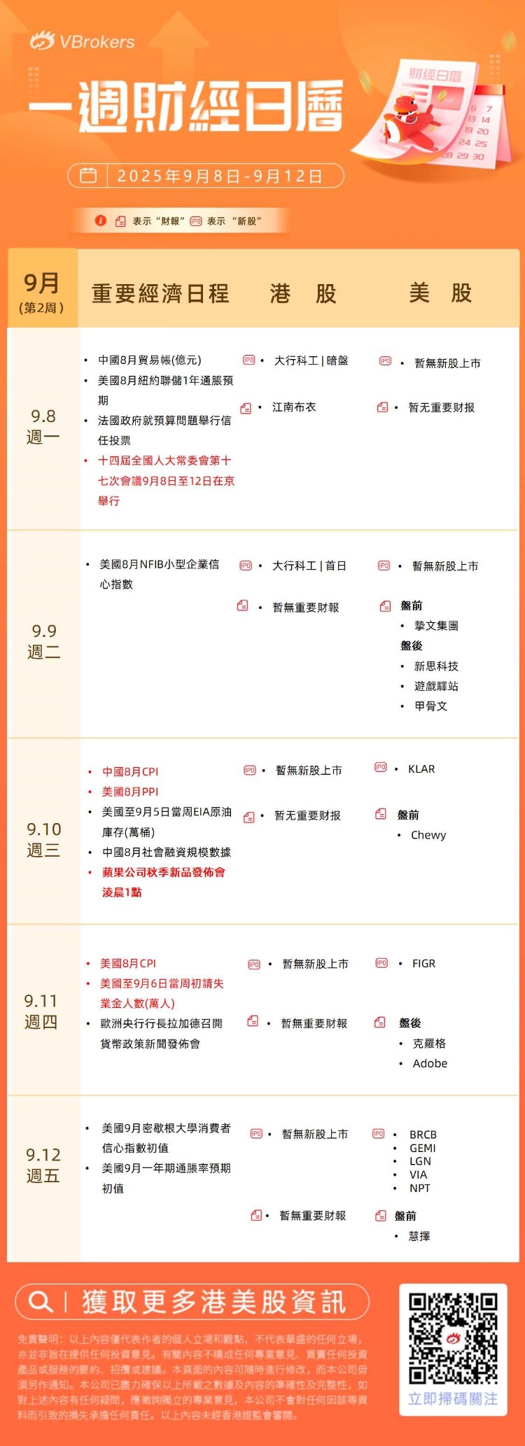 展望下週,聚焦熱點中美兩國8月CPI經濟數據以及美國8月PPI,投資者要重點關注美國經濟數據,以尋找更多降息的線索。此外,蘋果秋季新品發佈會凌晨1點舉行,iPhone 17能否提振蘋果股價?