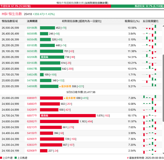 過去5日,恒指牛證合計約2702億港元資金淨流出套現;恒指熊證則合計約5228萬港元資金淨流入。街貨分佈方面,恒指牛證街貨佔比約67.3%,分佈在收回價24700點至25100點之間,累計相當約3526張期指合約;恒指熊證街貨在收回價25500點至26100點之間,累計相當約2999張期指合約。