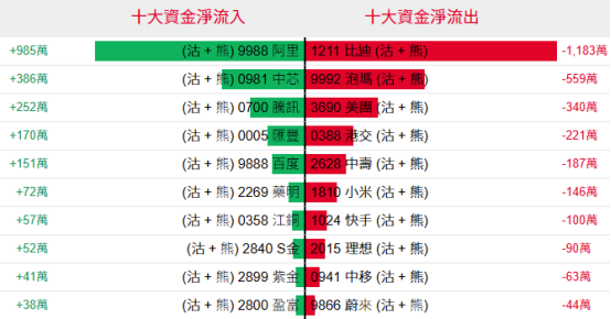 淡倉(認沽證及熊證)方面,近5日合計,阿里巴巴、中芯國際以及騰訊控股等相關淡倉分別約985萬、386萬及252萬港元資金淨流入部署;比亞迪股份、泡泡瑪特及美團等相關淡倉則分別約1183萬、559萬以及340萬港元資金淨流出。