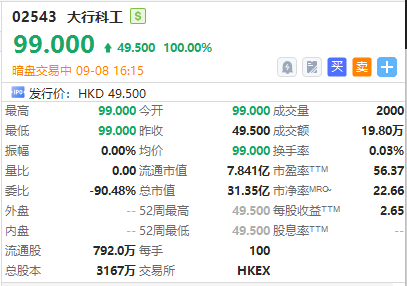 華盛資訊9月8日訊,港股摺疊單車大廠大行科工正在暗盤交易,截至發稿漲100%,報99.0港元/股,中籤一手賬面浮盈4590港元,最新總市值超31億港元。該股預計將於9月9日正式掛牌上市,配售結果將於今日晚間披露。