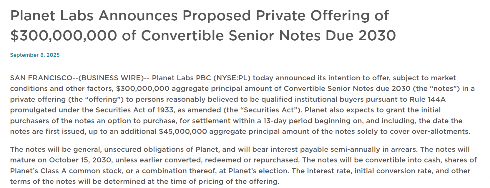 9月9日,Planet Labs美股盤後大跌逾12%!公司宣佈計劃發行3億美元債券之後,引發了投資者對公司財務狀況的擔憂。