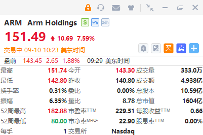 芯片軟件設計商ARM漲超7.5%,創7月末以來新高。