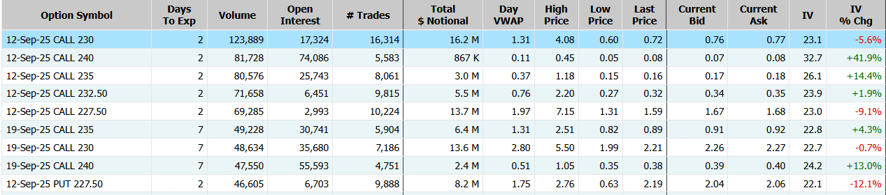 蘋果隔夜跌超3%,期權合約成交164.07萬張,9月12日到期的230美元的行權看漲期權交易量特別高,共有123,889份合約交易。 $AAPL 20250912 230.0 CALL$